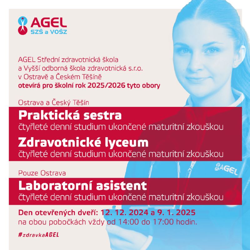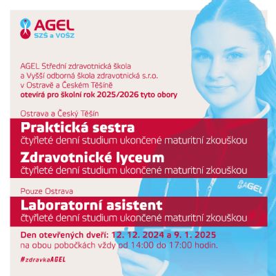 Den otevřených dveří na AGEL Střední zdravotnické škole a Vyšší odborné škole zdravotnické se koná 9. ledna 2025 od 14 do 17 hodin na pobočkách v Ostravě a Českém Těšíně. Zájemci si mohou prohlédnout prostory školy a seznámit se s nabídkou studia.
